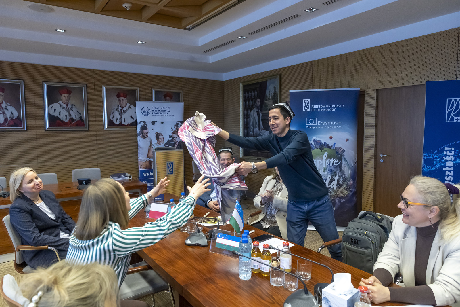 W spotkaniu powitalnym wzięli udział prorektor ds. studenckich i umiędzynarodowienia dr hab. inż. Bartosz Miller, prof. PRz, pracownicy działu wraz z kierownikiem mgr Edytą Ptaszek, wydziałowi koordynatorzy programu Erasmus z Wydziału Budowy Maszyn i Lotnictwa dr hab. inż. Andrzej Dzierwa, Wydziału Elektrotechniki i Informatyki dr inż. Paweł Dymora, Wydziału Zarządzania dr inż. Paweł Perz. Podczas spotkania mgr Monika Stanisz, koordynator wymiany akademickiej w pozaeuropejskim projekcie Erasmus przeprowadziła sesję informacyjną o Politechnice Rzeszowskiej w formie prezentacji i filmów promocyjnych oraz dopełniła wszelkich formalności związanych z mobilnością poszczególnych beneficjentów programu. Uczestnicy pokrótce zaprezentowali swoje uczelnie, skupiając się na wielkości uczelni, ich głównej działalności, współpracy międzynarodowej i własnych zainteresowaniach naukowych.