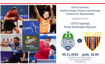 Klub Uczelniany Akademickiego Związku Sportowego Politechniki Rzeszowskiej zaprasza w najbliższy piątek 30 listopada o godz. 18:00 na mecz LOTTO Superligi Tenisa Stołowego Mężczyzn.
