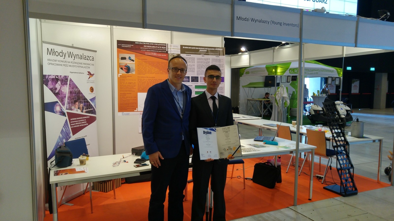 Niezmiernie miło nam poinformować, że podczas odbywających się targów INTARG 2017 (więcej w aktualnościach) Politechnika Rzeszowska była reprezentowana nie tylko przez dr. inż. Jacka S. Tutaka (został on nagrodzony za zbiór rozwiązań urządzeń mechatronicznych wspomagających proces rehabilitacji oraz ułatwiających funkcjonowanie osób starszych i niepełnosprawnych, w szczególności po udarze mózgu), lecz także przez studenta mechatroniki WBMiL Szymona Guraka.
