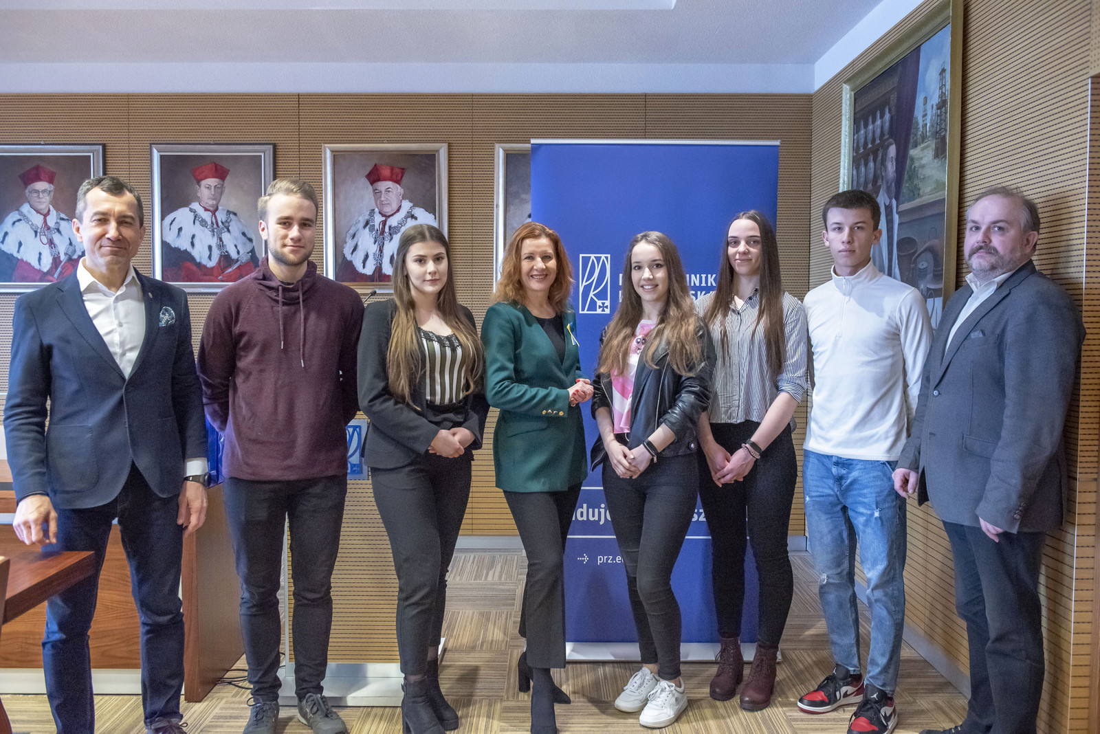 Studenci z Koła Naukowego Finansów i Zarządzania z prorektorem ds. studenckich prof. G. Ostaszem (pierwszy od lewej), dziekanem WZ prof. PRz B. Zatwarnicką-Madurą (pośrodku) i opiekunem koła dr. inż. M. Sołtysiakiem (pierwszy od prawej),
