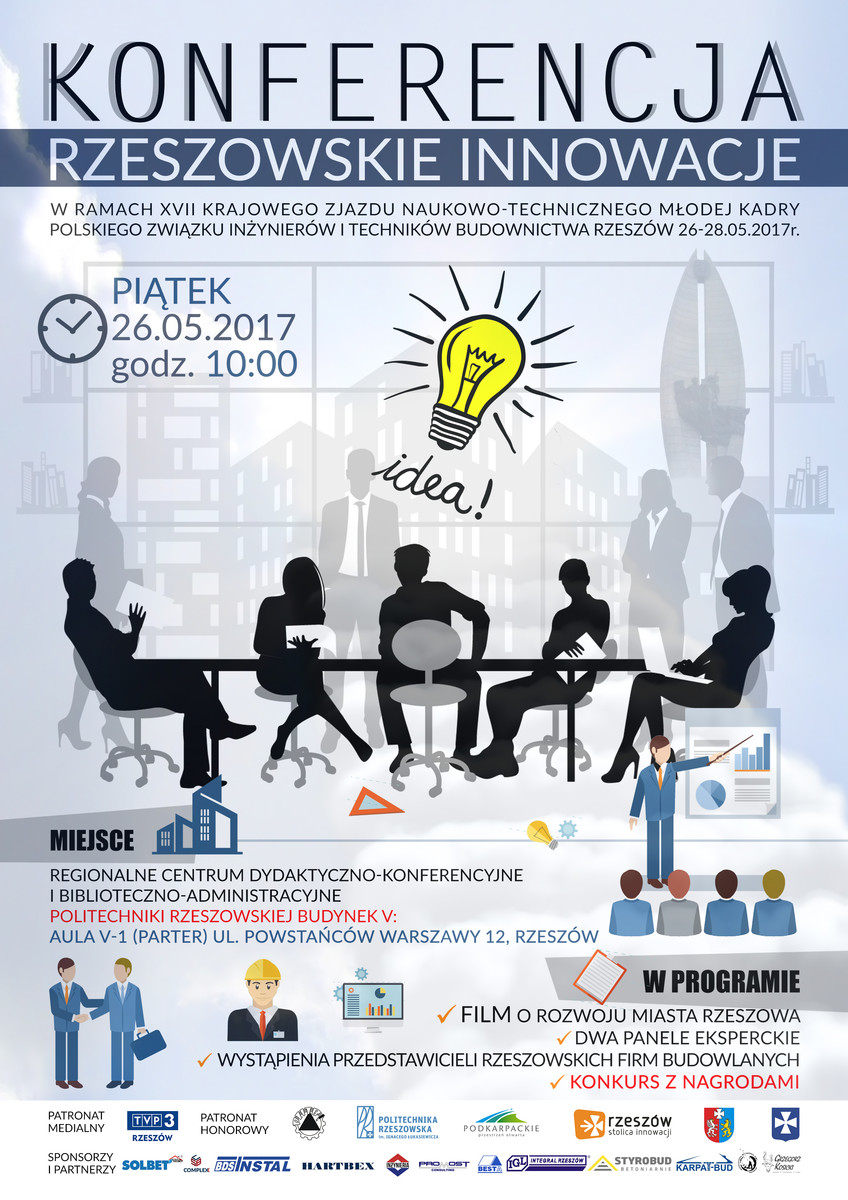 Od 26 do 27 maja br. w auli V-1 odbywać się będzie XVII Krajowy Zjazd Naukowo-Techniczny Młodej Kadry PZITB w Rzeszowie, w ramach którego zostanie przeprowadzona konferencja „Rzeszowskie innowacje”. Organizują ją studenci WBIŚiA zrzeszeni w Kole Młodych Polskiego Związku Inżynierów i Techników Budownictwa. W programie sesji przewidziano m.in.: film o rozwoju Rzeszowa, dwa panele eksperckie, wystąpienia przedstawicieli rzeszowskich firm budowlanych oraz konkurs z nagrodami. Więcej szczegółów na poniższym plakacie.